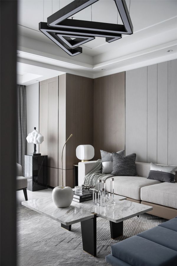 现代轻奢风格,利用化“零”为“整”的设计理念,舍弃掉多余的家具饰品,让光线可以更好的穿透,让家中每一个角落敞亮且静谧。通过色彩的深浅对比,拉伸空间的层次感,也使整体空间更加生动、活泼。