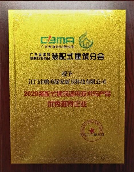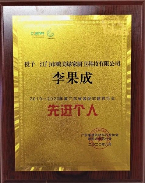 广东建筑科技周上,江门市鹏美绿家厨卫科技有限公司被评为“2020装配式建筑适用技术与产品推荐企业”,鹏美绿家总经理李果成先生被评为“2019-2020年度广东省装配式建筑行业先进个人”。