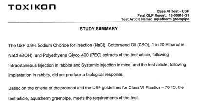 USP 6级测试报告证明了aquatherm阔盛的PPR管道不会污染或者干扰正在进行的生物和化学反应,因此可被应用于各种高敏感领域如医药、及生物化学厂等,也就是说德国阔盛是名副其实的医用级别PPR管道。
