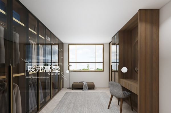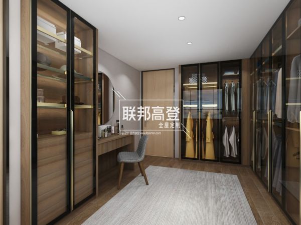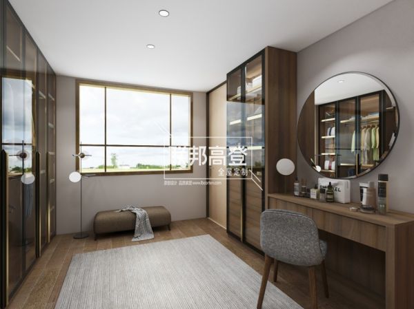 量身定制后的玻璃小柜与简易梳妆台自然地打成一片;规整层板分区可以妥善放置各式包包、帽子;至纯至简梳妆台一字柜带了两个小抽分担化妆用具、护肤品的收纳重担。