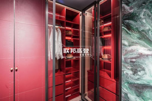 温润木纹中和着金属铝框的工业感,刚柔并济的碰撞中流露出知性迷人的张力;选用通透式的玻璃掩门巧妙让衣物躲避了往日被灰尘支配的恐惧。