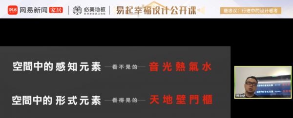 8月25日晚,由网易家居联合必美地板开展「易起幸福」设计公开课,本期嘉宾——近境制作设计总监 唐忠汉先生以《行进中的设计思考》为题,讲述了他对设计状态的独特理解:一开始的形式——机能——技巧——概念——心理仪式,他认为设计应该经由这一顺序,从心里深处去表达自己对生活的体会。