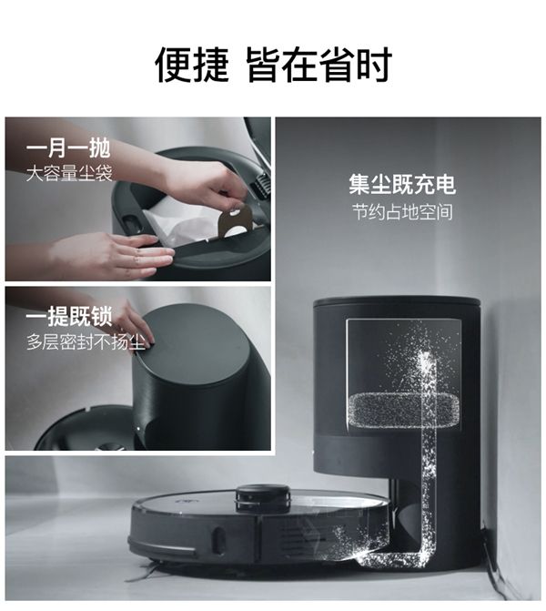 最让人眼前一亮的还是集尘宝的设计,兼具了集尘和充电的双重功能。当扫地机器人全局清扫回充后,集尘宝就自动开启集尘功能,强劲的大吸力,直达尘盒底部,将尘盒的垃圾顺着直线顺畅风道吸入集尘袋中,集尘效率高达98%;同时为了减少集尘过程中的扬尘、浮灰,浦桑尼克M8 Pro的集尘宝采用了四重过滤设计,从尘盒到集尘袋全密闭设计,集尘过程中不漏尘;尘袋更是采用了双重设计,里外两层,将灰尘收纳在中间层,灰尘始终不外露。
