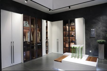 简影衣帽间门型具有曲线,打破传统方正造型的呆板,视觉效果更为柔和,暖白色柜体搭配黑色把手,整体更具质感。