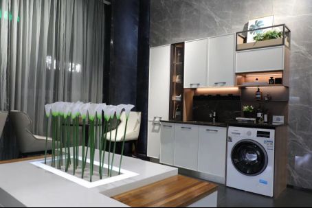 还有简约卫浴柜和阳台柜的设计也都十分走心。高低柜的设计能防止洗漱时的水溅,智能镜的运用让生活充满科技感。阳台柜中石材、木材、不锈钢互相融合搭配,满足更多场景的需求,开放置物架上还可以放置绿植,为生活添一点绿色。