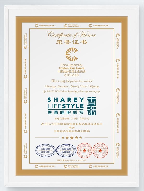 颁奖现场,香遇品牌管理(广州)有限公司凭借系列“黑科技”健康睡眠产品,成功斩获“中国旅游住宿业金光奖·科技创新奖”,意味着香遇对于酒店行业的智能健康领域有着举足轻重的影响力。