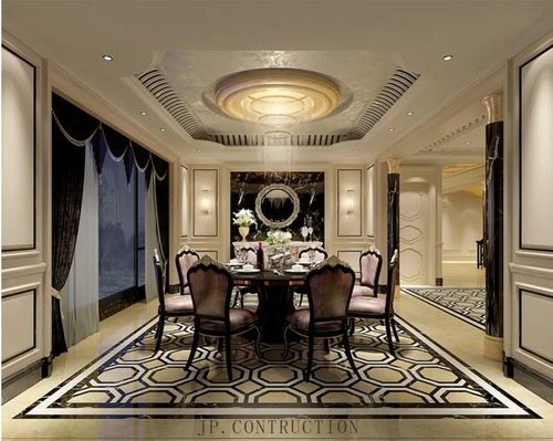 餐厅是一家人相聚就餐之地,美观和功能性都是必须考虑的因素。圆形的吊顶饰面与圆形的餐桌相呼应,配合温润色调且复古的餐椅,给人以柔和感。黑色窗帘搭配银质元素呼应的餐导台,结合柔和的灯光效果,营造轻松惬意的就餐氛围。