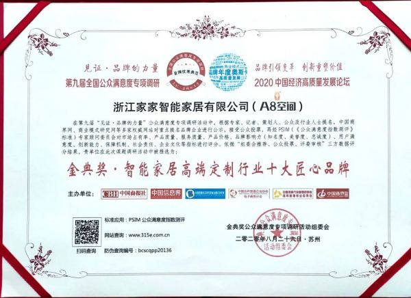 A8空间极简定制荣膺金典奖·智能家居高端定制行业十大匠心品牌