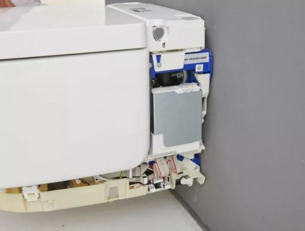 隐蔽式水箱右侧是电路专用通道,电线从通道内抽出,装上连接头,插入马桶右后方的电源插口内,即可通电。