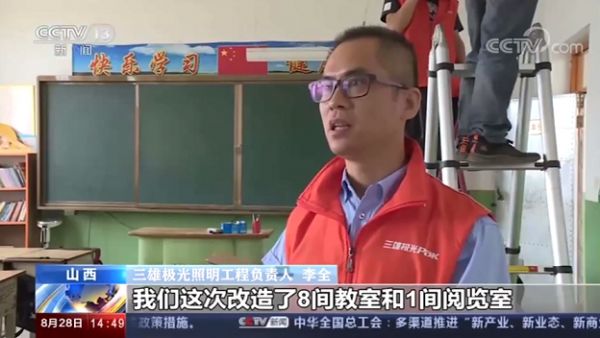 临近开学,中央电视台《新闻直播间》播出了山西省吕梁市文水县东城学校,利用暑期进行教室灯光升级改造一事。值得一提的是,此次教室灯光改造得到了广东爱心照明企业三雄极光的大力支持,为学校免费提供专业的教室照明设计和健康护眼的灯具。