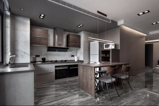 业主是单身男性,厨房选用了开放设计,更加年轻化、现代感。厨房延续了客厅的色调,在沉稳中不失个性,在硬朗中又是不温馨。