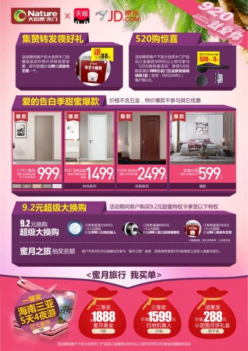为爱表白,我门有道。大自然木门甄选爆款产品,做你爱情的“最强助攻”。8月27日——9月20日,拍下买9.2元甜蜜特权卡享受三大换购福利。活动期间,客户下定大自然木门产品且订金缴纳3000元以上,即可在9月20日参加全国抽奖活动,有机会获得海南三亚5天4夜双人蜜月旅行。