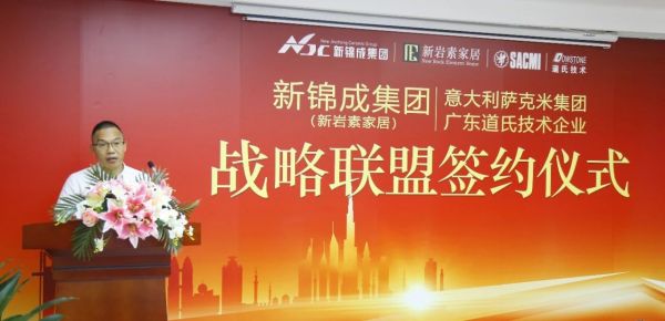 在签约仪式上,新锦成集团董事长何成健以毅然决然的态度宣告了新锦成陶瓷进军岩板新领域的决心。他指出,内部项目立项长达半年有余,经过多维度的调查与研究讨论,对制造中心选址、产品品质定位、品牌定位及产业链布局等方面都经过了详细精准的布局。