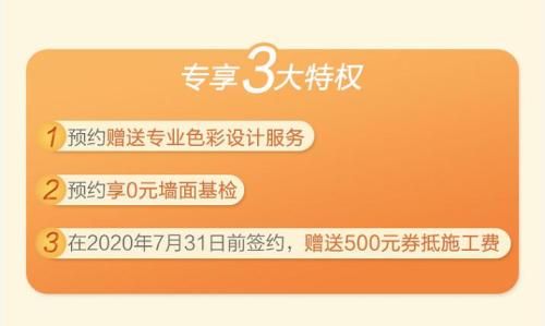 特权三:7月31日前签约赠送500元券抵施工费。多乐士贴心推出签约赠送优惠券的特权服务,让用户眼里欣赏家之美,心里暖意浓。