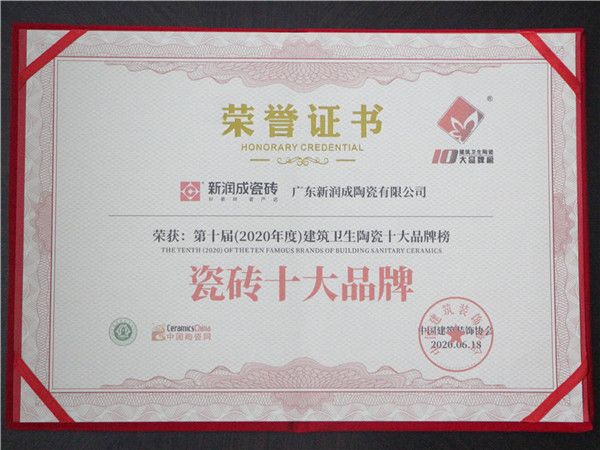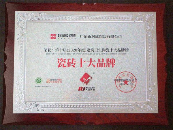 经过公正严格的评选,新润成瓷砖以强大的品牌影响力荣获2020年度“建筑卫生陶瓷十大品牌榜”“瓷砖十大品牌”称号,在企业的荣誉簿上再添殊荣。这不仅是活动主办方对新润成瓷砖品牌实力的肯定,也是行业内外对新润成瓷砖品牌实力的认可。