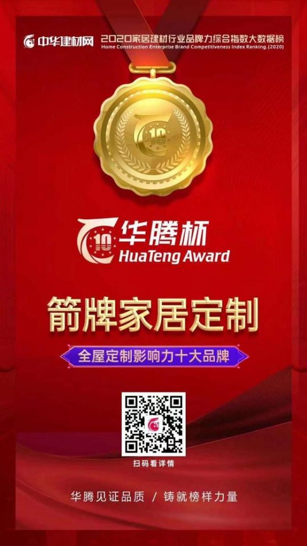 这是箭牌家居定制连续五年荣获此荣誉,此次荣获"华腾杯"2020全屋定制影响力十大品牌奖项是市场、行业媒体以及消费者对于箭牌家居定制的实力的认可,见证了箭牌家居定制发展历程中光彩的一笔!