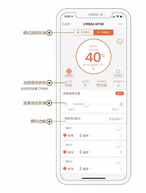 梅赛思还特地为MT系列壁挂炉增加了定时预约及APP远程控制功能。用户可以预设壁挂炉开机时间及供暖温度,当到达预定时间后,壁挂炉将开机并以预设温度运行,提供舒适的供暖服务(该功能需通过APP实现)。通过APP的远程管理,用户可以自由设定壁挂炉的工作模式和温度,更可实时反馈机器故障,智能提醒,打造一个智能舒适的居家生活环境。