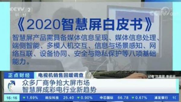 中怡康数据显示,今年6月,国内彩电销量同比去年大涨20.3%,7月虽同比下滑8.3%,但降幅已明显小于前几个月。随着9月的到来,国内房地产行业也将迎来持续走高之势,将会带动电视产业发展,电视销量将走高。种种迹象表明,电视机销售将回暖。对此,央视财经频道《正点财经》作出专题报道,关注市面上第一块智慧大屏——荣耀智慧屏在推出后一年来的市场表现。