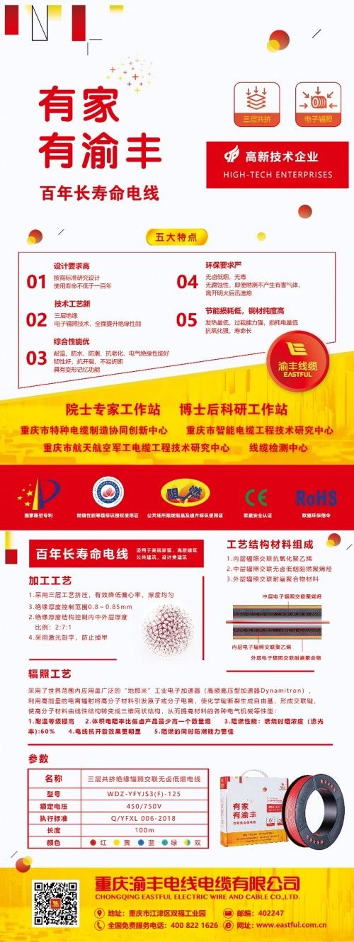 渝丰百年长寿命电线,铜线外有三层保护——防潮层、绝缘层和聚合物材料层。防潮层对外保护铜线,防止在厨房类的潮湿环境下,外界水汽渗入损坏铜线;绝缘层对内保证不发生漏电现象;聚合物材料层则负责防止鼠蚁啃咬磨损。适用于高端家装、高层建筑、公共建筑及一些环境恶劣的场所。