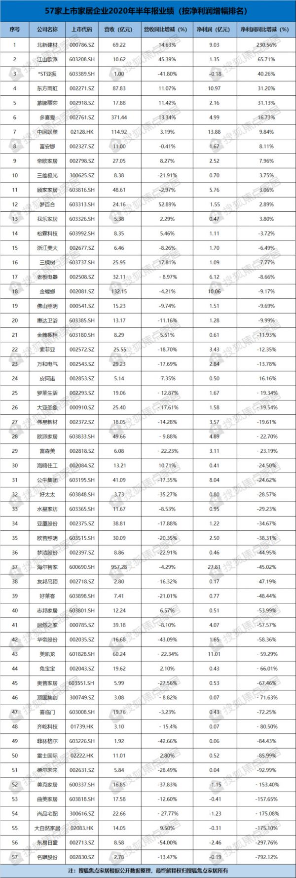 近日,多家家居行业上市公司陆续发布2020年半年报。搜狐焦点家居统计在A股、港股上市的57家家居企业半年报后发现,今年仅有9家企业在2020年上半年实现了营业收入和净利润的双增长;17家企业实现营收增长,13家企业净利润呈现正增长,其中3家企业净利润增长超过40%,36家企业不尽人意,营收、净利双双下滑。
