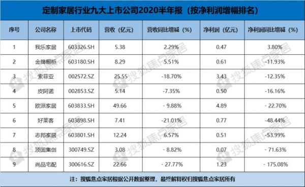 此外,净利润下滑超过100%的名单中还出现了一家定制家居企业的身影。搜狐焦点家居了解到,尚品宅配上半年营业收入22.66亿元,比上年同期下降27.77%,归属于上市公司股东的净利润亏损1.23亿元,比上年同期下降175.08%。尚品宅配表示,上半年受新冠肺炎疫情影响,公司生产经营面临较大挑战,销售量下降导致营收下滑,但从第二季度开始已基本恢复正常,线下的量尺数在第二季度也有同比4%的增长。