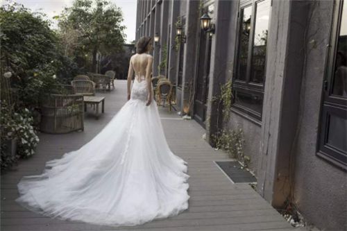 4、还有一款就是露背婚纱,这款婚纱虽然从前面看起来和普通婚纱没有什么去吧,但它是从后背进行设计的,所以后背才是一个较大的亮点,纤细的身姿可以得以凸显,非常的迷人。