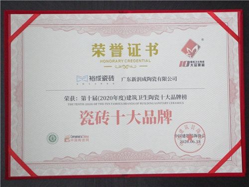 喜报!裕成瓷砖拿下2020年度“建筑卫生陶瓷十大品牌榜”瓷砖十大品牌称号