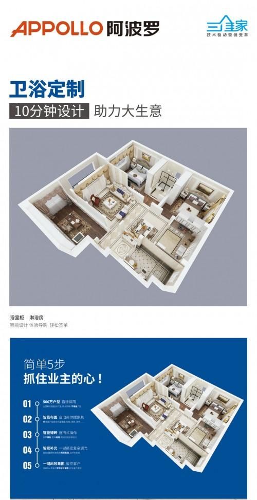 阿波罗专门开设三维家生产定制设计软件培训,该软件操作简便、可视化展示,10分钟搞定卫浴定制设计,助力经销商轻松下单!