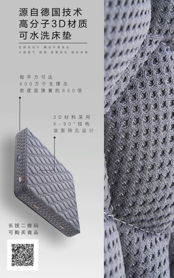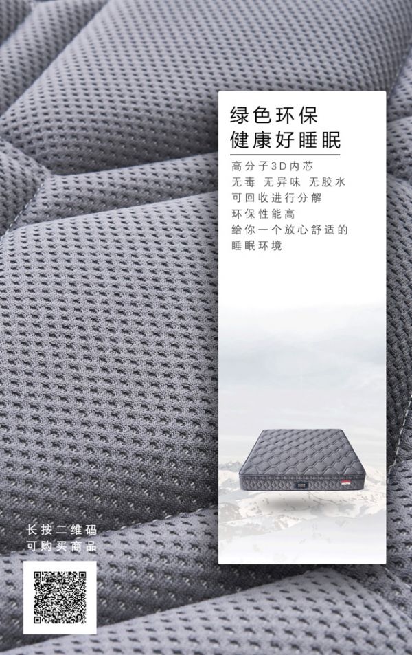 源自德国科技睡眠的3D睡感床垫。3D材料属于高科技材料,是德国原创技术,需要进口设备,制造难度大,设备要求高,技术含量高,因此在床垫品类独占鳌头的特性。