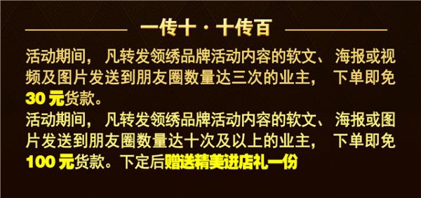 活动期间,凡转发领绣品牌活动内容的软文、海报或图片发送到朋友圈数量达十次及以上的业主,下单即免100元货款。