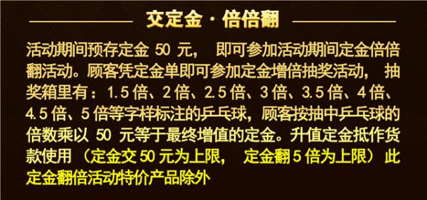 活动期间预存定金50元,即可参加活动期间定金倍倍翻活动。顾客凭定金单即可参加定金增倍抽奖活动,抽奖箱里有:1.5倍、2倍、2.5倍、3倍、3.5倍、4倍、4.5倍、5倍等字样标注的乒乓球,顾客按抽中乒乓球的倍数乘以50元等于最终增值的定金。升值定金抵作货款使用(定金交50元为上限,定金翻5倍为上限)此定金翻倍活动特价产品除外。