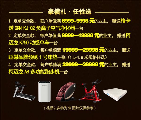 4. 定单交全款,每户单值满29999—39998元的业主,赠送柯迈龙A8多功能跑步机一台。