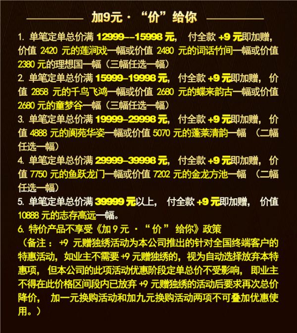 2.单笔定单总价满15999-19998元,付全款+9元即加赠,价值2858元的千鸟飞鸿一幅或价值2680元的蝶来韵古一幅或价值2680元的童梦谷一幅(三幅任选一幅)