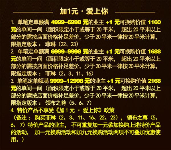 1.单笔定单额满4999-6998元的业主+1元可换购价值1160元的单间一间(面积限定小于或等于20平米,超出20平米以上部分的需按店面价格补足差价,少于20平米一律按20平米计算,限指定版本:菲琳(22、23)