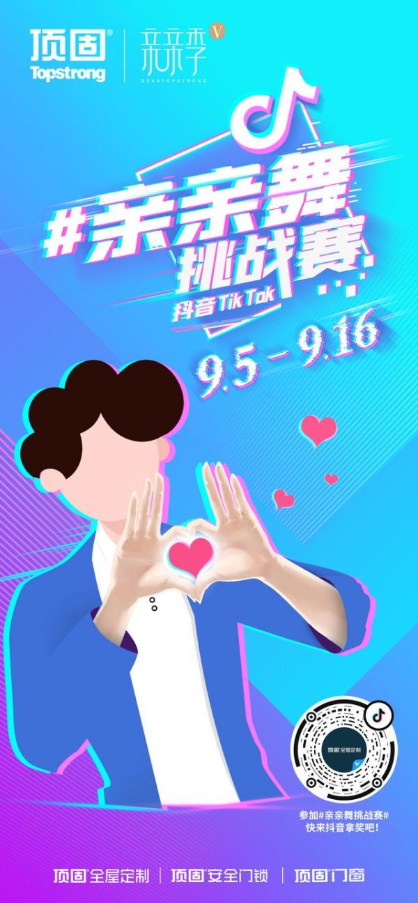 在2020顶固亲亲季第五季品牌盛典来临之际,顶固携抖音创新性地发起2020顶固“亲亲舞”抖音挑战赛,鼓励线上线下所有视频创作人共同参与打卡亲亲舞,探索新生代创意潮流形式,升华内容创意营销价值,传递品牌爱与温暖的力量。