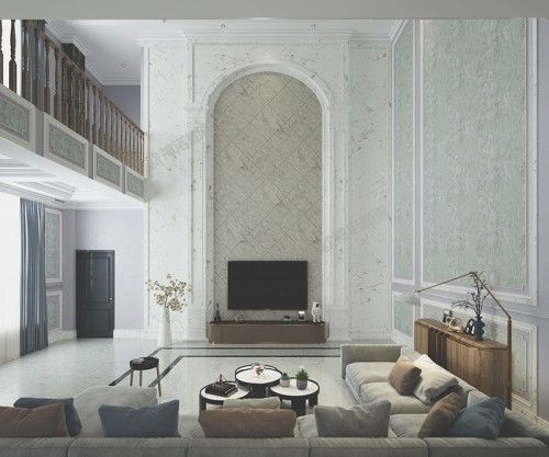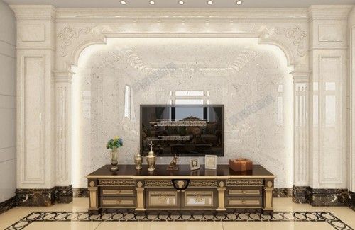 用罗马套线等配件来装饰,是欧式背景墙的标准操作。人造石具有非常出色的加工可塑性,无论是线条、门套还是柱式等异型定制,都可以轻松搞定,因此活用人造石异型部件,打造有立体感、精致感的背景墙,出来的效果当然精美绝伦。
