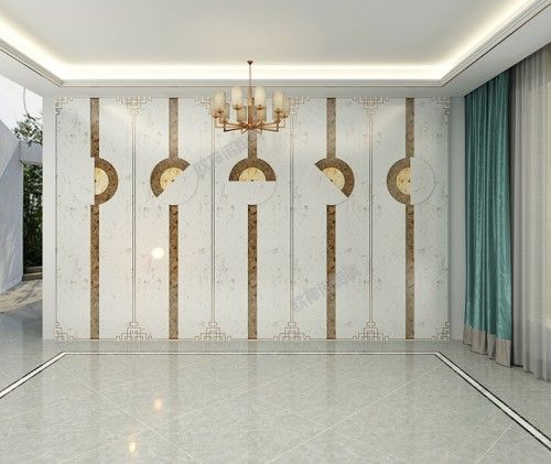传统的背景墙要求完整、恢弘的气派,一般都是大板直接上墙,做成连纹或者对纹的效果,很有气派,但是对于现代住宅来说,这种效果反而过于抢眼,很难搭配整体空间的风格。
