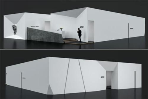 展厅的空间设计在空间上保持着一种理性的建筑秩序,简洁墙面设中式园林框景和漏景,隔而不堵,含蓄而雅致。极简的建筑设计、静谧的空间氛围充分诠释东方哲学的内涵。