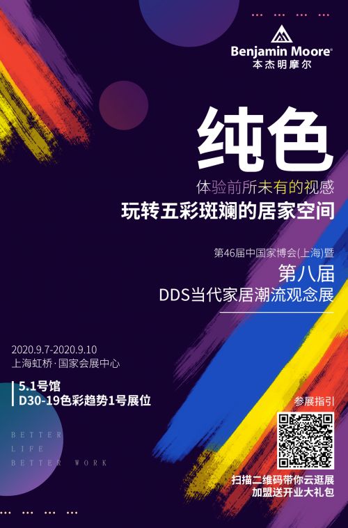 第46届中国家博会,位于上海虹桥国家会展中心,本杰明摩尔展位位于5.1号馆D30-19色彩趋势1号展位,如果您不能到现场,可以扫码云逛展会。了解现场更多精彩。