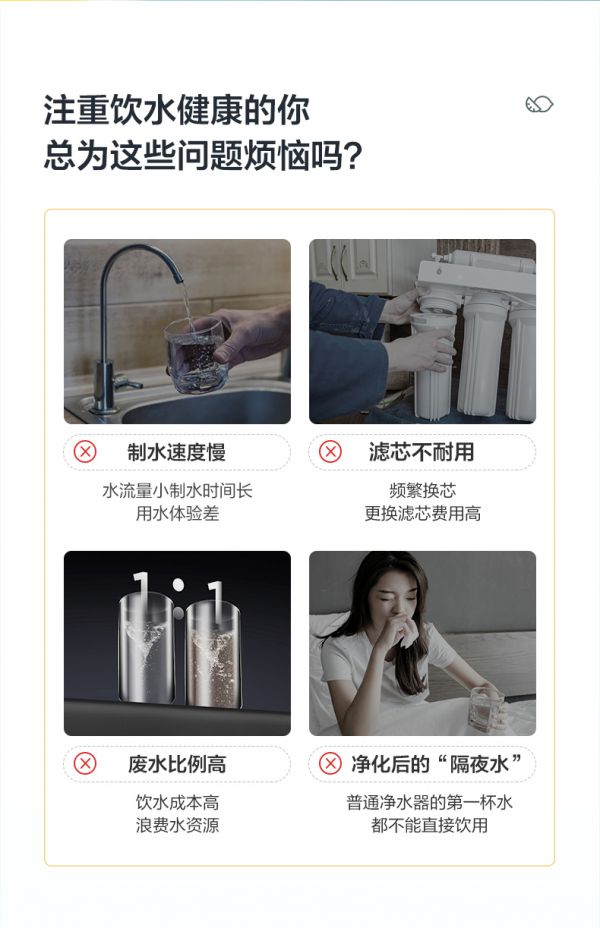 近年,市面上净水产品现象级涌现,着实让人挑花眼。可是,市面上传统的净水器普遍存在“第一杯水TDS值高”的技术弊端。当净水器处于静止状态时,废水中的溶质会通过RO膜,渗透进入纯水端,造成第一杯水TDS值高,不可直接饮用。饮用水前需放掉第一杯水,不仅造成水资源的浪费,还增加等待的时间成本,让体验大打折扣。