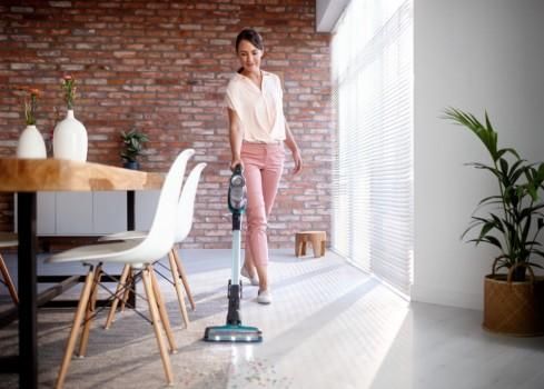 要完成一次彻底无尘的居家清洁,扫地和拖地两个步骤缺一不可,所以重复劳动往往是打扫卫生繁重劳累的根源。一种家用清洁器械要简化清洁程序,必须包含除尘和湿拖等各种功能,同时还需操作方便。飞利浦无绳吸拖一体机FC6908集吸尘、湿拖和手持式吸尘三位一体,能够自动调节拖布中的水流,让水均衡地分布在纤维布上,实现多孔出水,高效去污。在整个吸尘过程中为各种类型地板保持适合的湿度,有效应对大理石、瓷砖、木地板、地毯等多栖材质,一次性对抗多种污染物、瓦解顽固污渍,展现令人惊叹的清洁能力。无需二次打扫,不必弯腰辛苦,没有重复劳累,轻松享受超感洁净体验,还没来得及体会劳动的疲倦,眼前已是洁净一新的家。