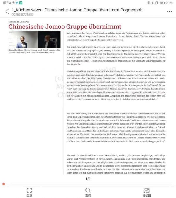 今年7月,据外媒报道,“此前申请破产的德国顶级橱柜品牌Poggenpol(博德宝)已经被九牧成功收购,合同将在未来几周内生效,在此之前仍需满足一些先决条件,双方不愿透露收购价格。”