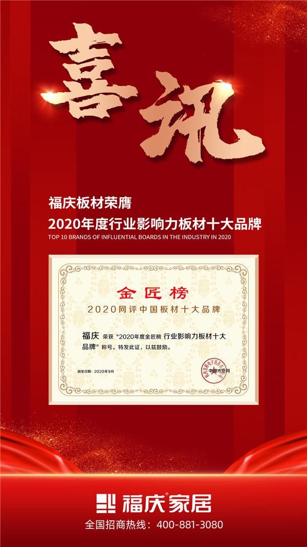 9月1日,由中国木业网举办的『2020年中国板材“金匠榜”』的网络评选活动正式发榜,福庆斩获 “行业影响力板材十大品牌” 荣誉。该活动旨在为消费者宣传优质板材品牌,并通过活动影响力弘扬匠心精神,引领板材行业健康稳定发展。