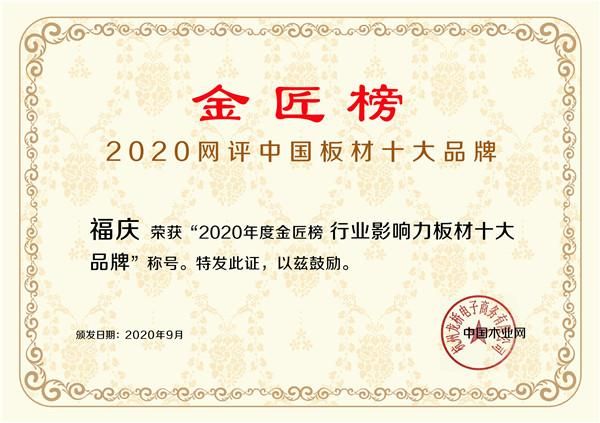 2020中国板材金匠榜由中国木业网倾力打造,从2014年至今已连续举办6年,以其权威性与专业性成为当前行业的重要活动。“十大板材品牌”更是成为板材行业品牌的至高荣誉之一,是光彩夺目的“荣誉勋章”,代表着板材行业的年度品牌标杆,福庆亦连续6年荣获“中国板材十大品牌”称号。