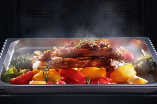 在喷蒸方面,新品第五代蒸烤箱NK55TCB采用了立体喷蒸技术;由水箱加入水之后通过隐藏的纯不锈钢蒸汽发生器产生蒸汽,直喷到内腔进行烹饪;同时蒸烤箱配置了上、下、后四组烤管。使得这款产品在烤功能方面更加出色。