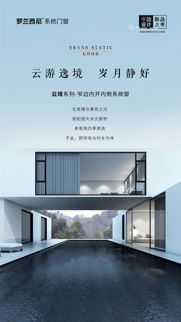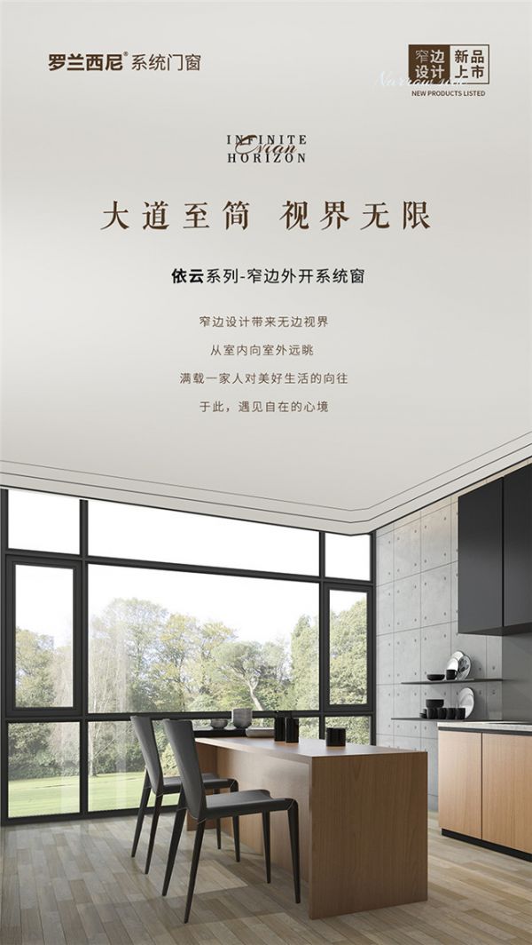 罗兰西尼系统门窗洞察用户的需求痛点,践行国家绿色环保的号召,不断创新研发系统门窗技术,推出两款绿色环保的窄边窗新品——云境系列窄边内开内倒系统窗和依云系列窄边外开系统窗。极窄边框、广阔视野,人性化设计满足用户的不同需求。
