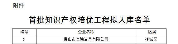 9月8日,佛山市市场监督管理局对佛山首批知识产权培优工程拟入库名单进行公示,浪鲸卫浴凭借在知识产权创造、运用、管理、保护等方面的优势,上榜"首批知识产权培优工程拟入库名单"。