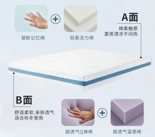 我购入的是纾兰的青春活力款,这款床垫最特别的地方就是它有A、B两面,A面是适合炎热夏季使用的,利用凝胶记忆绵和轻柔活力绵打造出清凉不闷热的绵柔触感,其中,凝胶记忆绵材质能够有效吸收人体多余热量和湿气,让睡眠环境保持干爽舒适,而轻柔活力绵上密集分布的绵密泡孔在透气抗菌的同时,还可以根据受压程度产生不同反弹力,回弹力更好,这种床垫可以有效缓解肌肉的压力,虽然和之前一样是睡六七个小时,但是我明显感觉到晚上的睡眠质量更好了,早上一觉醒来神清气爽,特别舒服。