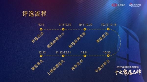 本届评选活动于9月15日正式启动;9月16日—9月30日期间,家居建材企业可在线上申报,同时主办方将对参选品牌进行全网公示;10月12日-10月19日消费者进行网上票选;10月30日将由专家评审会进行投票;11月8日揭晓榜单,并在 12 月 12 日于举办盛大的颁奖典礼。