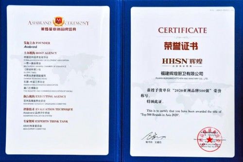 辉煌厨卫是中国五金制品协会副理事长单位、中国建筑卫生陶瓷协会卫浴分会副理事长单位、国家首批节水认证产品生产企业、国家首批水嘴中国环境标志产品认证企业、采用国际标准企业、中国建筑卫生陶瓷协会3A级信用企业。公司“HHSN”商标被国家工商总局认定为中国驰名商标。集团公司先后荣获中国名牌产品、中国十大卫浴品牌、中国十大工程卫浴品牌、亚洲品牌500强、国家权威检测达标产品、国家工程建设推荐产品、中国消费者放心购物质量可信产品及国家奥林匹克体育中心指定专用产品等荣誉和称号。